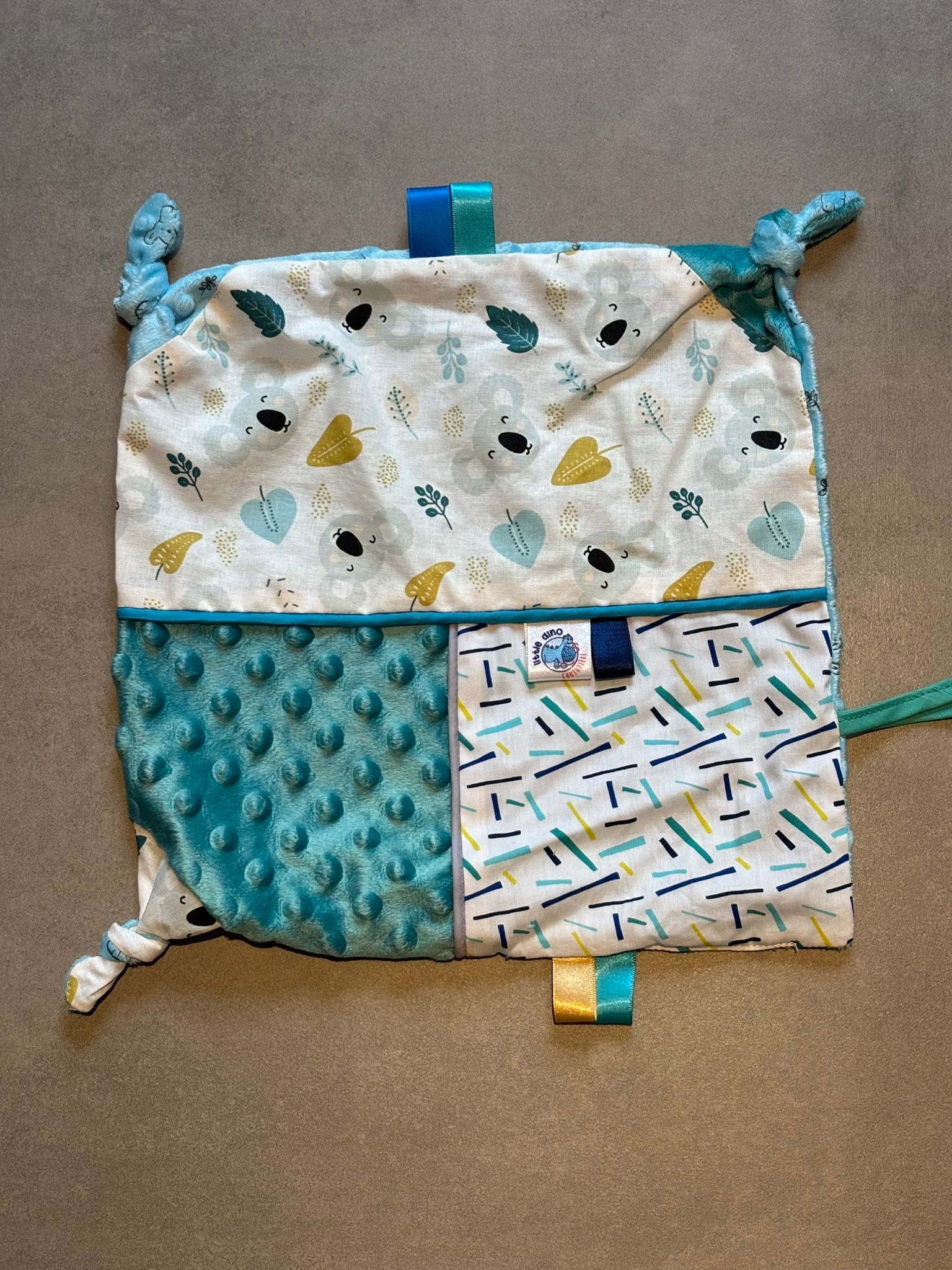 Doudou carré OEKO-TEX® – Koalas bleus & motifs graphiques