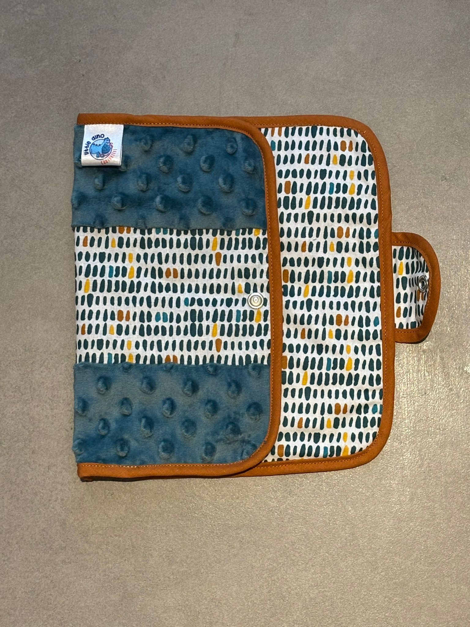 Protège carnet OEKO-TEX® – Gouttes colorées & Minky bleu pétrole