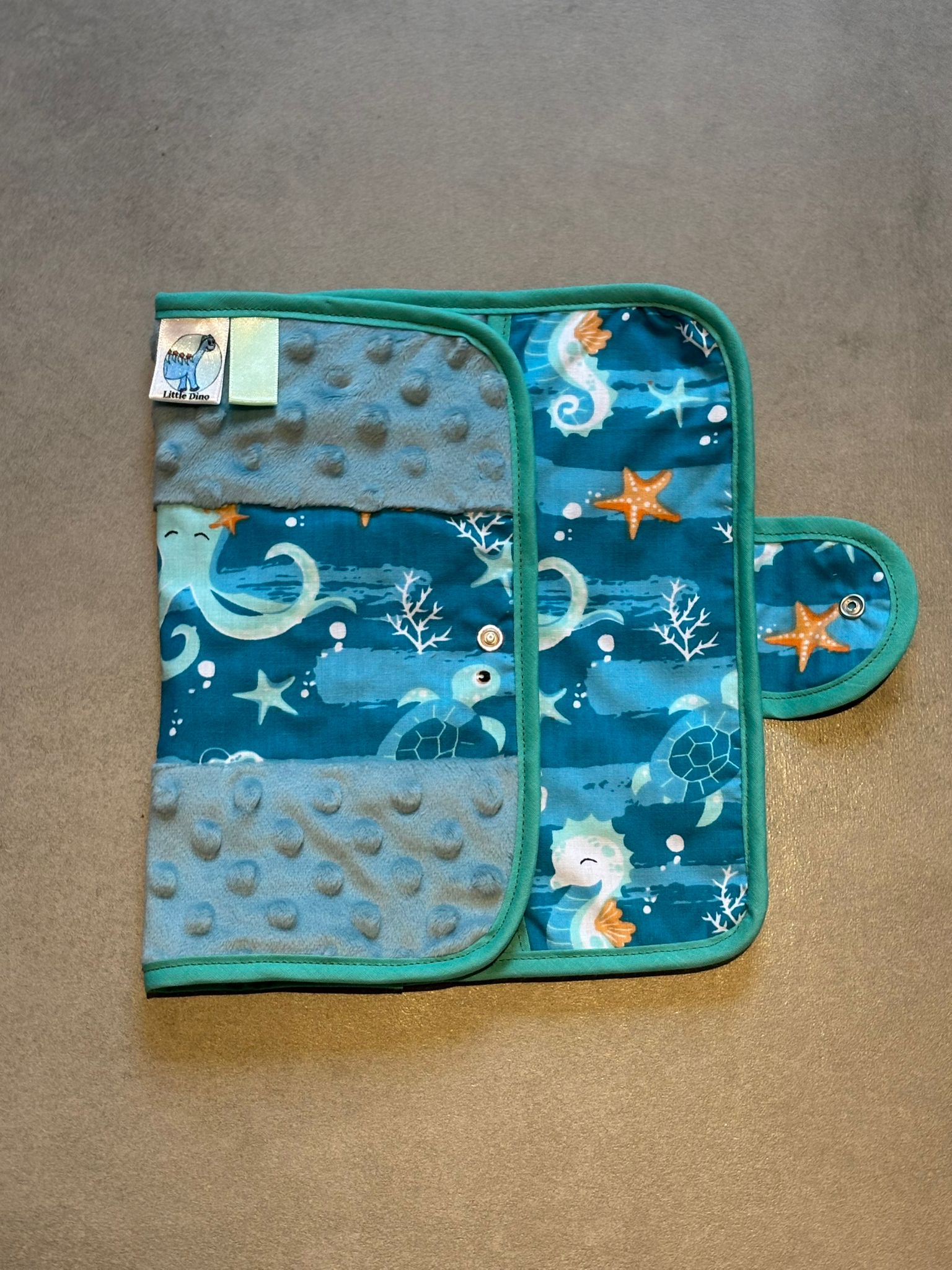 Protège carnet OEKO-TEX® – Monde marin & Minky bleu lagon