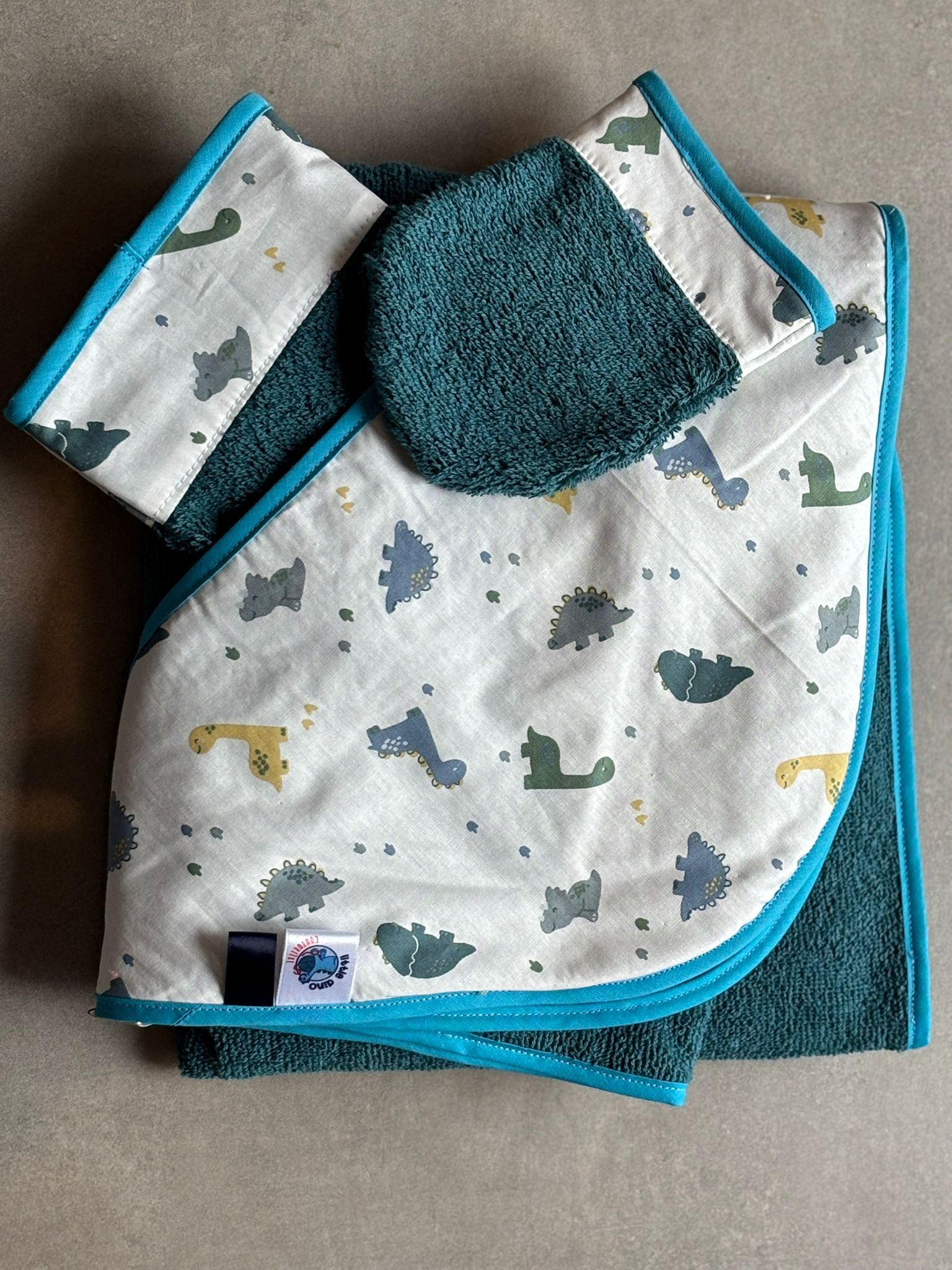 Sortie de bain OEKO-TEX® – Petits Dinos Bleu & Moutarde
